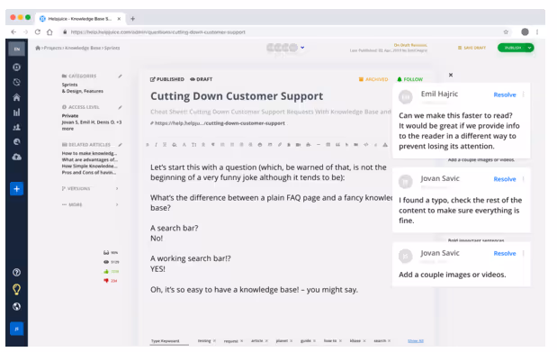 Helpjuice knowledge base software streamlines the process of knowledge sharing for both your team and your customers. The platform is easy to use, with an editor that's straightforward making content creation fast and simple. Their intelligent search feature is designed to allow your customers and team to find the information they need, when they need it.