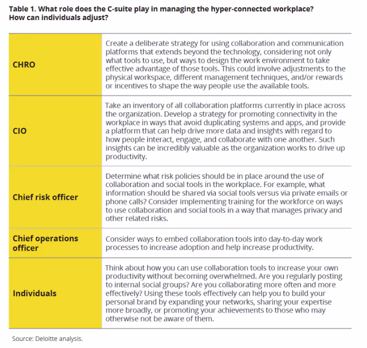 Analysis by Deloitte (pictured below) also explores the role of the C-Suite in managing the hyper-connected workplace. Touching on how CHROs, CIOs, CROs, COOs, and individuals can adjust to the changing world of hyper-connected work, this analysis provides an excellent starting point for organizations to better understand the roles and responsibilities of each C-Suite member.
